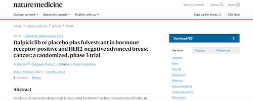 11月4日,国际四大医学期刊之一、英国《自然》旗下《自然医学》(Nature Medicine)在线发表CDK4/6抑制剂达尔西利(SHR6390)联合氟维司群治疗既往内分泌治疗后疾病进展的HR+/HER2-晚期乳腺癌的多中心、随机、双盲III期临床研究(DAWNA-1研究)中期分析结果报告,首次对氟维司群(雌激素受体降解剂)±达尔西利治疗激素受体阳性晚期乳腺癌的有效性和安全性进行了比较。研究结果显示,达尔西利+氟维司群组与安慰剂+氟维司群组相比,无进展生存期(PFS)显著延长。该项研究由中国医学科学院肿瘤医院徐兵河教授担任leading PI,全国39家医院参研,由j9国际站临床研发团队支持完成。